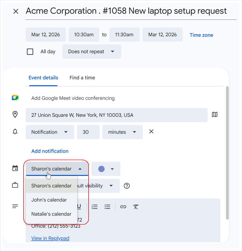 Use the Add to Calendar option from the ticket interface in Replypad and proceed.