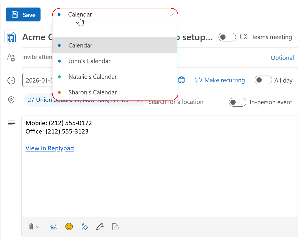 - A native Microsoft 365 or Google calendar event window will open, pre-filled with all the relevant details for a new event. From there, select the date, time, and user’s calendar, then confirm.